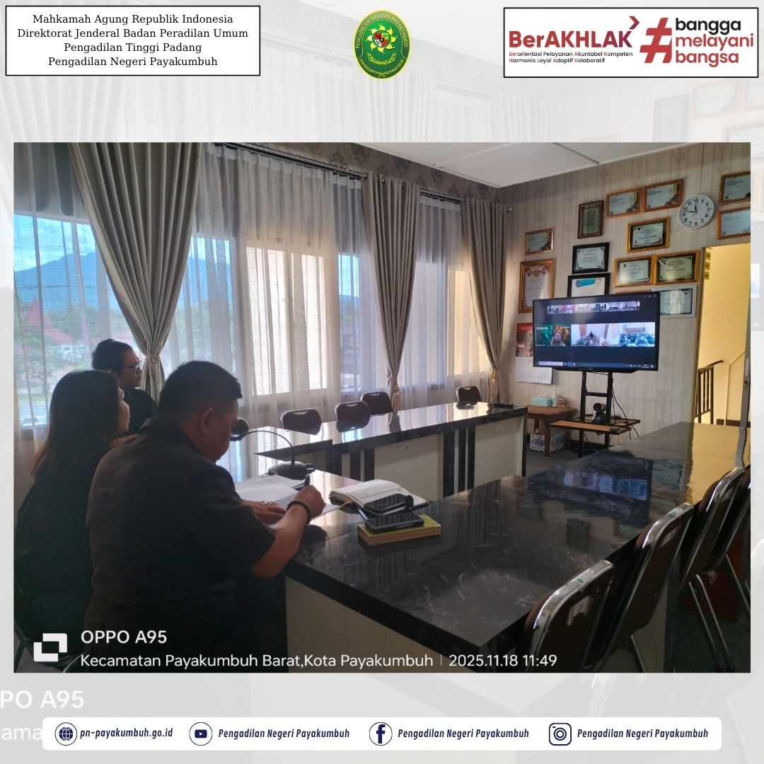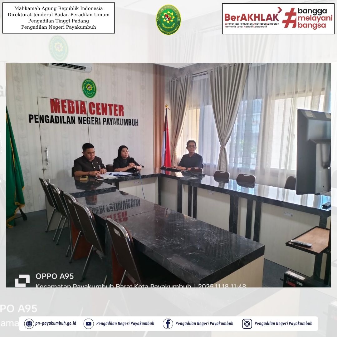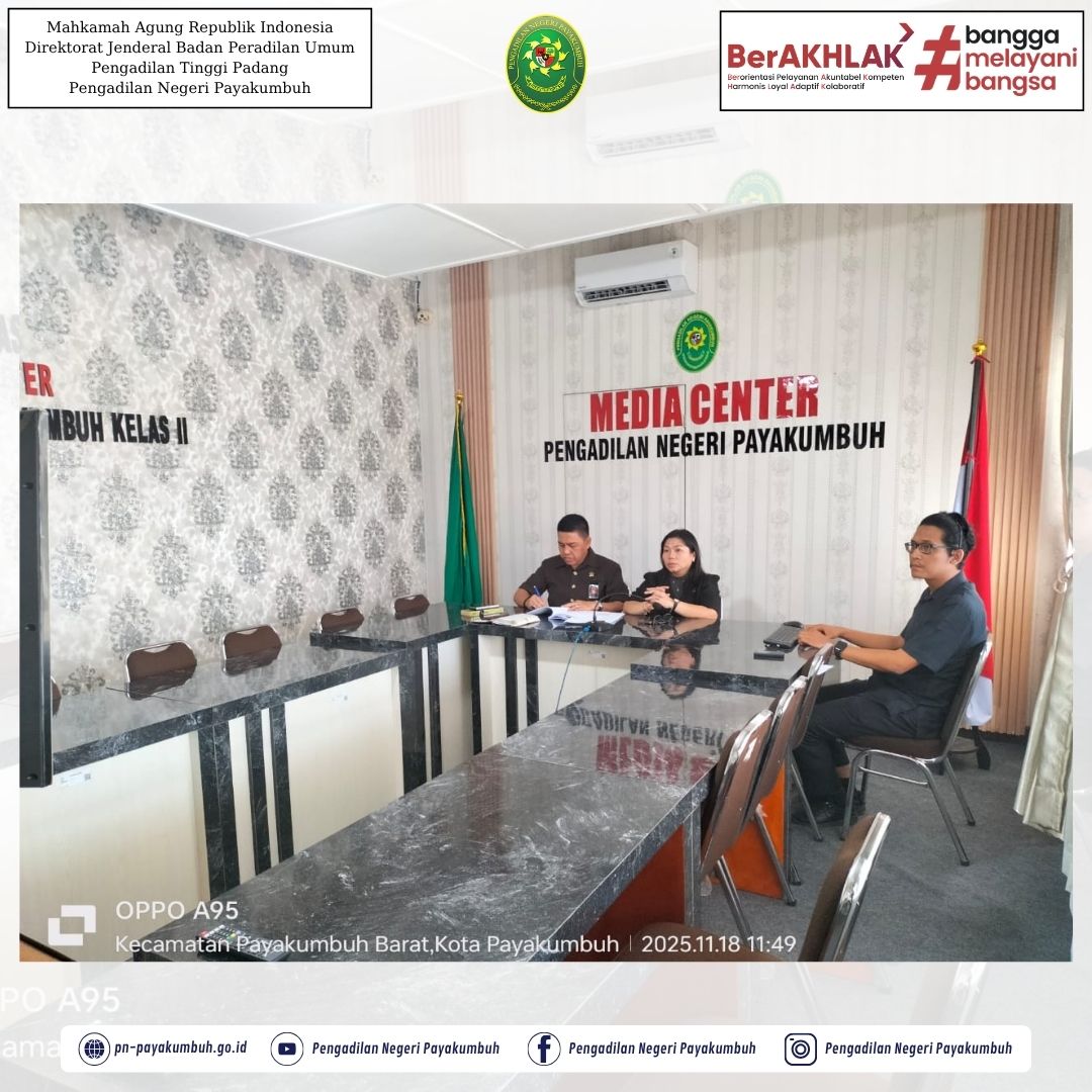 Payakumbuh | Selasa, 18 November 2025 — Menindaklanjuti Surat Undangan dari Direktur Pembinaan Administrasi Peradilan Umum Mahkamah Agung RI selaku Plh. Direktur Jenderal Badan Peradilan Umum No. 316/DJU/UND.DL1.10/XI/2025 tanggal 17 November 2025 perihal Undangan Sosialisasi Pembaruan Aplikasi SIPP Tingkat Pertama Versi 6.0.1, maka Ketua, Wakil Ketua, Panitera serta Staf IT pada Pengadilan Negeri Payakumbuh mengikuti kegiatan Sosialisasi Pembaruan Aplikasi SIPP Tingkat Pertama Versi 6.0.1 di Ruangan Media Center Pengadilan Negeri Payakumbuh. Kegiatan ini berlangsung mulai pukul 08.30 WIB.